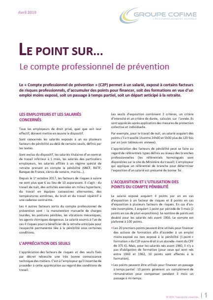 Tous les salariés relevant du droit privé peuvent disposer d'un compte professionnel de prévention (à condition d'être exposés à des risques les agents non titulaires de la fonction publique, qui ne relèvent pas du droit public, ont accès au c2p. Les salariés acquièrent des points en fonction de leur exposition à l'un ou plusieurs des facteurs de risques concernés par le c2p. La 5ème ordonnance sur la loi travail du 22 septembre 2017 a créé le compte professionnel de prévention (c2p) en remplacement du compte personnel de prévention de la pénibilité (c3p), reprenant les droits acquis dans ce dernier.